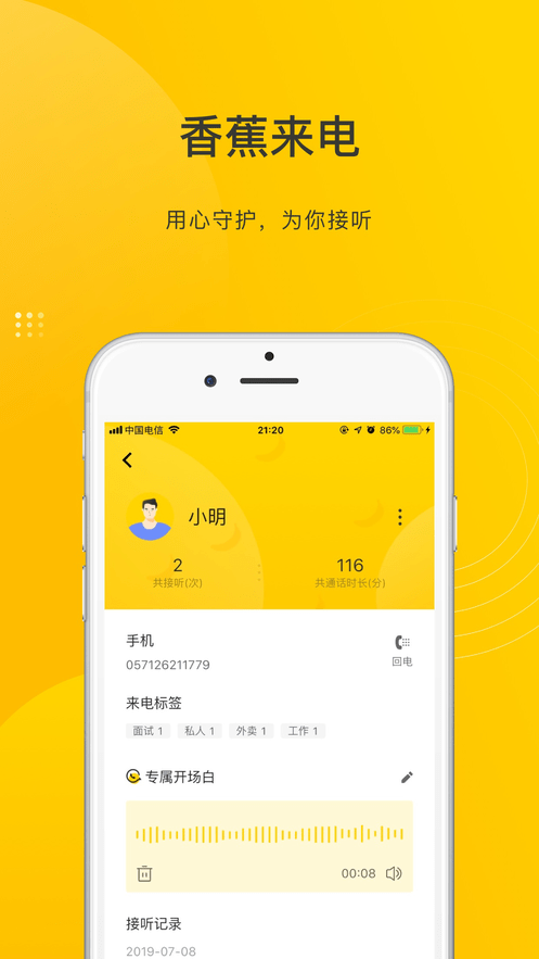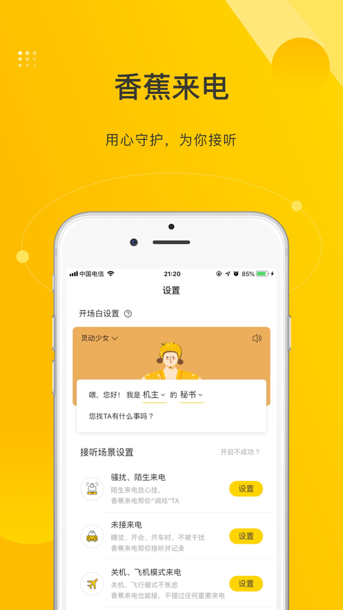 香蕉来电是一款热门的手机来电管理软件,在软件中有海量的语音来电模式,并且支持对未接来电的处理,方便的来电管理免费为您接听电话,也可以智能的应答防止各种骚扰。