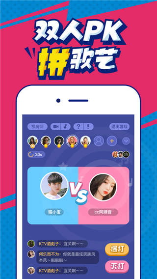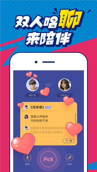 1、软件采用双人畅聊的方式,提供了抢歌拼歌平台;
