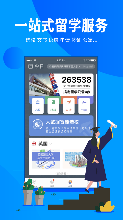这是一款留学服务应用,Ai智能选校方案、服务标准收费、申请全程透明。为留学生们提供专业的留学申请服务。支持英国、美国、澳洲、新西兰、加拿大,等热门国家所有学校,同时还有文书、语培、雅思托福口语及阅读课程,签证等增值服务。