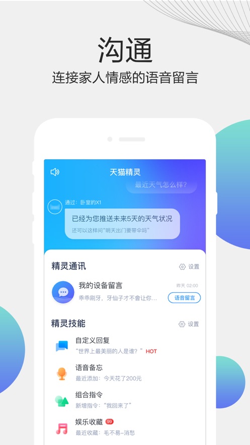 天猫精灵app是一款智能的语音助手应用,帮助用户可以通过该应用更好的进行了解与使用天猫精灵,从而能够获得更好的天猫精灵的用户使用体验哦,有需要的朋友可以来下载使用哦。