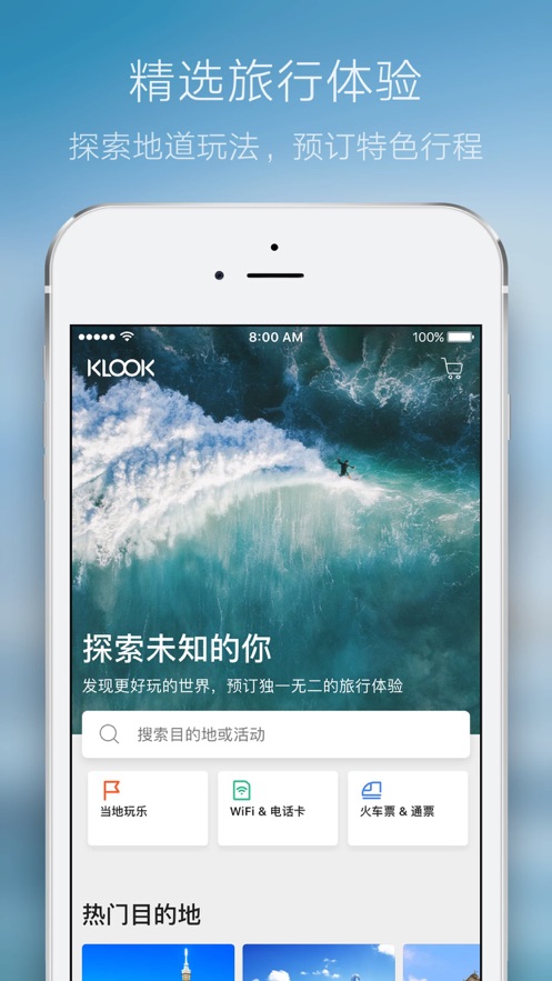 这是一款旅行应用,深度挖掘全球200+热门旅游目的地,带来50000+优质旅行活动:景点门票、一日游、户外活动、美食;机场接送、交通票券、Wifi上网卡,应有尽有。打破你对旅行的既有定义,一站开启全新玩法。