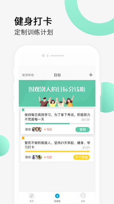 这是一款健身运动目标任务应用。帮你克服种种困难,助你达成你目标养成好习惯、专注学习成长。在这里你可以挑战自我,达成你的每一个计划或目标,也可以监督和围观别人的计划、目标获得收益。