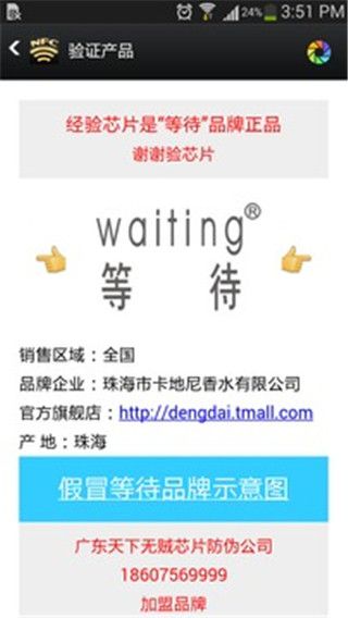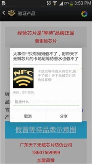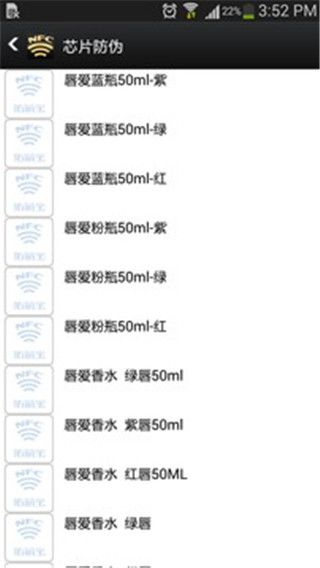 手机NFC商品真假防伪验证软件,每个商品都贴有一张高频标签,通过手机的NFC功能快速读取高频标签完成商品真伪验证,无论你在何时何地都可以进行产品真伪查询,让消费者避免购买到假货