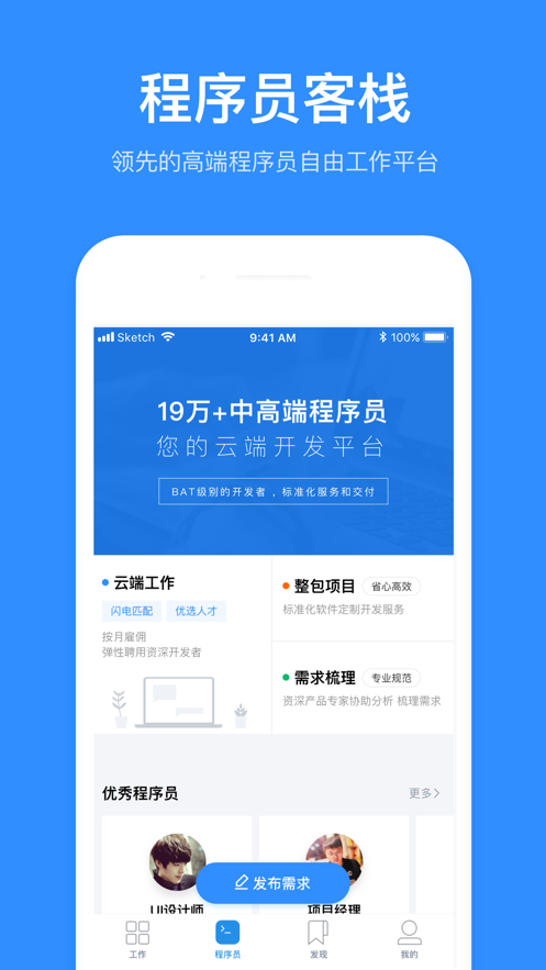 这是一款领先的中高端程序员自由工作APP。我们致力于为程序员提供稳定的线上兼职、远程工作机会。项目方可通过我们找到全国各地各类BAT级人才。所有签约开发者均经过严格身份、经验与作品认证。
