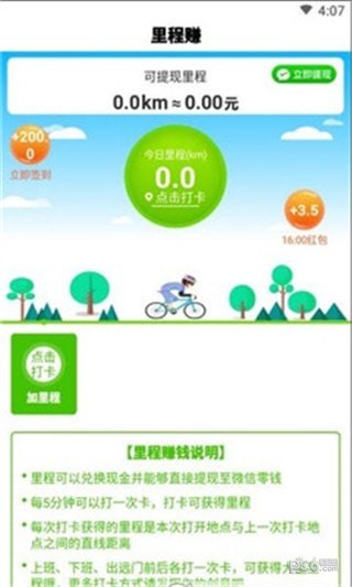 里程赚赚APP是一款走路运动的应用软件。在里程赚赚APP中只需走路就可以轻轻松松的赚钱,每天走路打卡会赚取更多的奖励。使用软件让赚钱变得更轻松,上班下班走路等就能很轻而易举的赚到钱。快来下载吧。