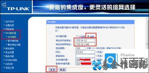 9、接着以172.16.1.1作为副路由器管理地址进行登陆。然后依次点击DHCP服务器→DHCP服务在右侧勾选启用 DHCP服务。比如小编所设置的参数,范围为172.16.1.2~192.168.1.199( 只要够用就行)。最后点击确定按钮。
