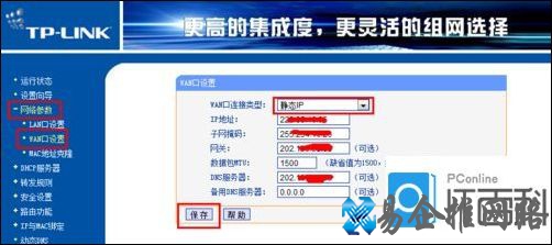 4、接着以192.168.0.1作为主路由器管理地址进行登陆。切换至WAN接口项,根据电信服务商所提供的连接类型来选择WLan口连接类型,本例以静态IP地址为例进行讲解。如果电信服务商提供的是静态IP地址登陆方式,则根据所提供的IP相关信息进行如图所示设置: