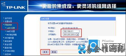 登陆主路由器管理界面,依次展开网络参数→LAN设置,将IP地址设置为192.168.0.1,子网掩码设置为255.255.255.0,最后点击确定按钮重启路由器。
