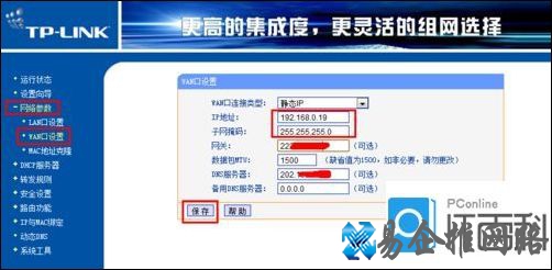 登陆副路由器管理界面,依次展开网络参数→WAN口设置,将WAN口连接类型设置为静态IP,然后设置IP地址为192.168.0.19,子网掩码设置为255.255.255.0,其它设置与主路由器对应位置设置保持一致。最后点击确定按钮重启路由器。