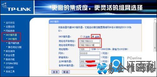 5、接下来点击DHCP服务器→DHCP服务,然后在右侧勾选启用 DHCP服务,同时设置地址池的开始地址和结束地址,由于是两台路由器,因此可以根据与当前路由器所连接的电脑的数量进行设置,比如小编所设置的参数,范围为192.168.0.3~192.168.0.19。最后点击确定按钮。