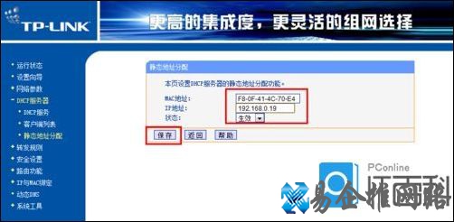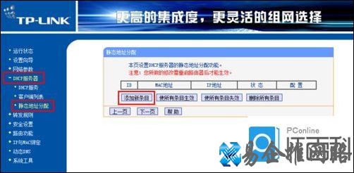 6、将副路由器IP与其MAC进行绑定。切换至静态地址分配选项卡,然后点击添加新条目按钮,将将副路由器IP与其MAC地址进行绑定,这样就确保在进行动态IP地址分配时副路由器的IP地址始终为192.168.0.19。