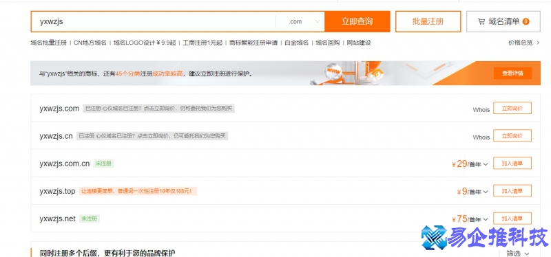 定义好域名后,就要选择种类了,各种后缀的域名都有,比较常用的就是com cn,如果做官网就选择这两种后缀的比较好,并且利于SEO排名。