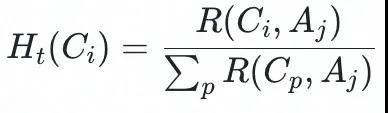5.对于每组实验 Et,基于之前的人群和素材的投放标签数据,我们可以从我们在DAM管理的素材标签与过往数据的对比中,大概预算出一个内容和一组人群之间的相关度 R(Ci, Aj) ,那么对于单组人群 Aj,这次我们投放计划 P(Ci, Aj) 的先验投放概率为: