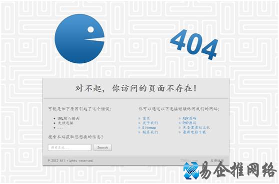 制作友好的404错误页面,提醒用户访问出错信息,引导用户进行首页或目录查找,提供站内查找功能或网站管理员联系方式。