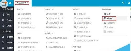 2、在上方主导航位置点击【产品与服务】--【云解析】,查看域名解析列表;
