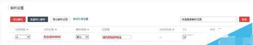 5、按照如下步骤设置:选择记录类型为A记录;主机记录为空或填写www;记录值填写要绑定的主机IP地址;TTL默认即可。点击保存,即可完成域名解析设置。