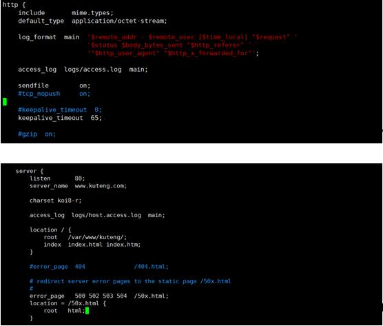 Nginx默认的配置文件在/usr/local/nginx/conf/nginx.conf,配置文件主要包括:全局、event、http、server设置,event:主要用来定义Nginx工作模式,http提供web功能、server用来设置虚拟主机,server必须位于http内部,一个配置文件中可以有多个server