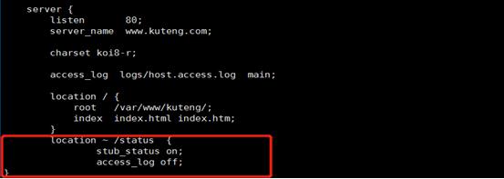 修改nginx.conf配置文件,指定访问位置/status并打开stub_status配置