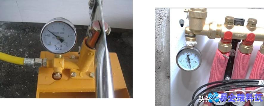 9. 第一次冲洗试压:压力测试是地暖施工中重要的环节,以检验系统是否存在漏水现象或施工故障。测试时应以每组分、集水器为单位逐回路进行,建议家里留人配合检测。