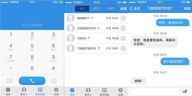 APP的下载与使用过程也很简单和方便,通过APP store搜索IOKS即可。在APP的界面中,与我们平时使用的手机界面一样,包含了拨打号码和发送短信以及查找联系人的功能,而除此之外,则多了一个设置的功能,可以根据自己的实际使用习惯进行更改。