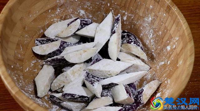 将切好的茄子块放入盆中,加适量的淀粉拌匀。